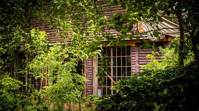 An ashtray has been placed, teetering on the edge of a rotting picnic table in the corner of the yard.