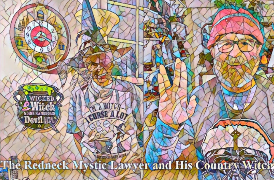 Right when I’m standin there squintin at the package, checking my six, thinking about opening it up and taking a few of them mail ordered dark web disco biscuits, who rolls up… The mystic redneck lawyer.